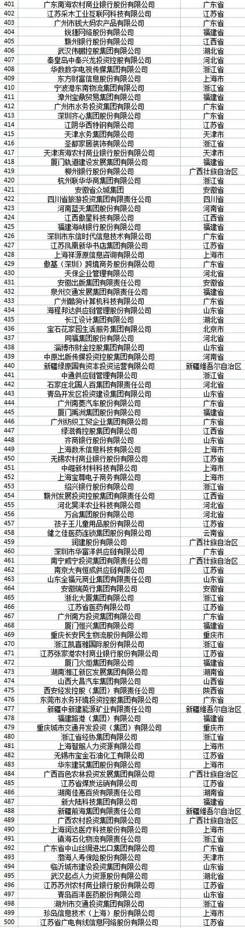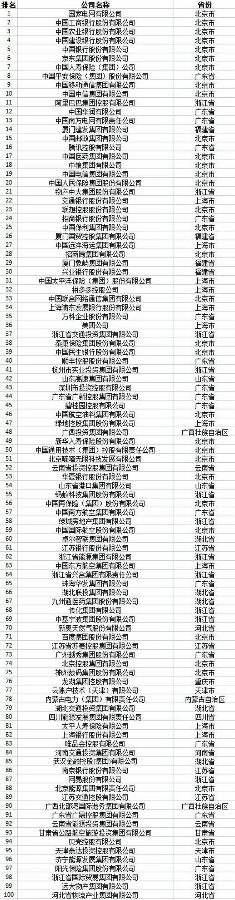 位列榜單前10位的企業(yè)分別是:國家電網(wǎng)有限公司、中國工商銀行股份有限公司、中國農(nóng)業(yè)銀行股份有限公司、中國建設(shè)銀行股份有限公司、中國銀行股份有限公司、京東集團(tuán)股份有限公司、中國人壽保險(xiǎn)(集團(tuán))公司、中國平安保險(xiǎn)(集團(tuán))股份有限公司、中國移動(dòng)通信集團(tuán)有限公司和中國中信集團(tuán)有限公司。