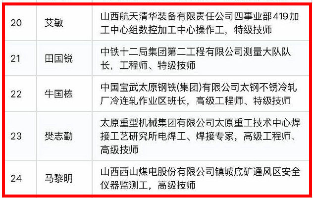 他們分別是:山西航天清華裝備有限責(zé)任公司四事業(yè)部419加工中心組數(shù)控加工中心操作工,特級(jí)技師艾敏;中鐵十二局集團(tuán)第二工程有限公司測(cè)量大隊(duì)隊(duì)長(zhǎng),工程師、特級(jí)技師田國(guó)銳;中國(guó)寶武太原鋼鐵(集團(tuán))有限公司太鋼不銹冷軋廠冷連軋作業(yè)區(qū)班長(zhǎng),高級(jí)工程師、特級(jí)技師牛國(guó)棟;太原重型機(jī)械集團(tuán)有限公司太原重工技術(shù)中心焊接工藝研究所電焊工、焊接專(zhuān)家,高級(jí)工程師、高級(jí)技師樊志勤;山西西山煤電股份有限公司鎮(zhèn)城底礦通風(fēng)區(qū)安全儀器監(jiān)測(cè)工,高級(jí)技師馬黎明。