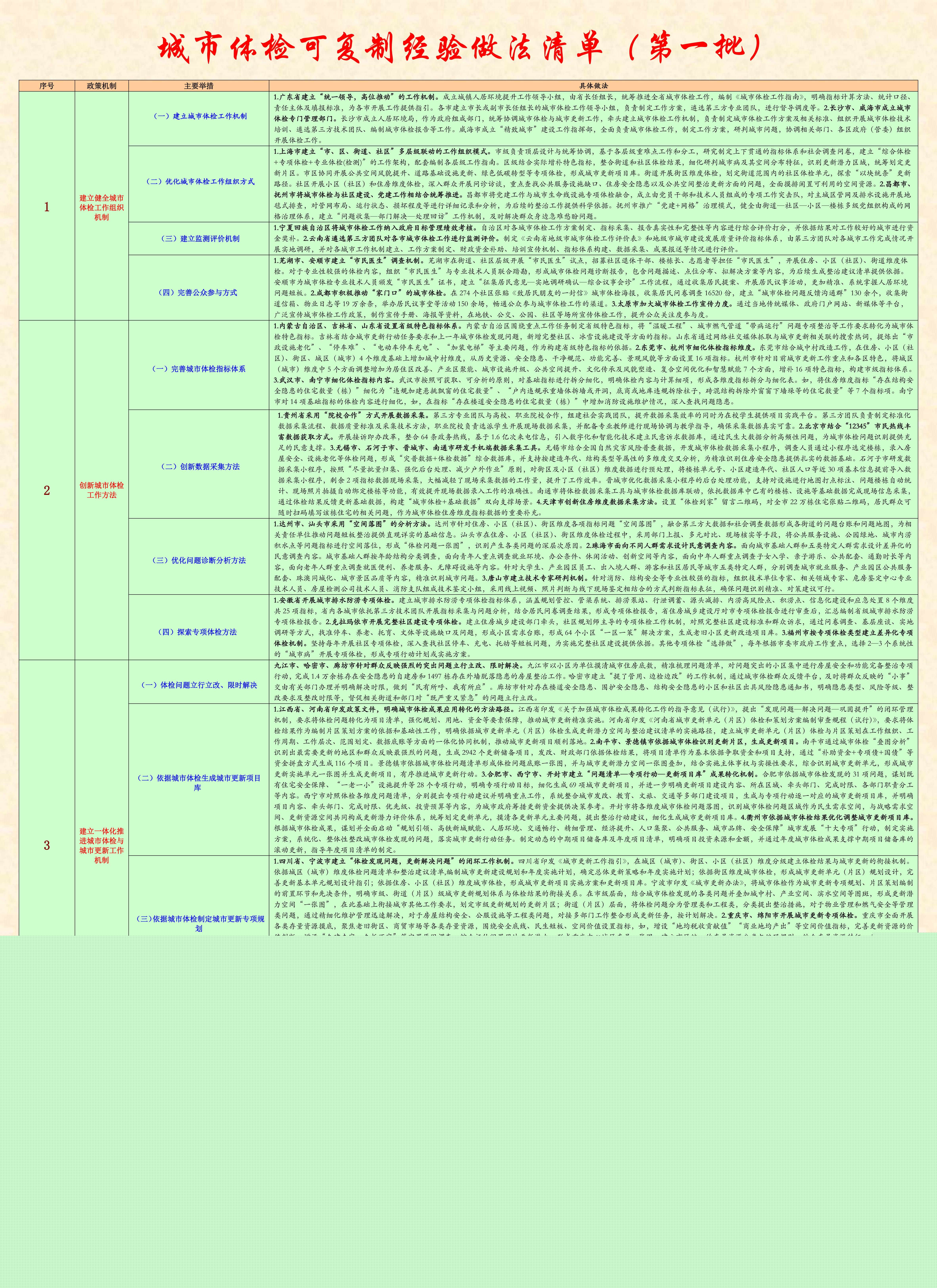 為貫徹落實中央城市工作會議精神和《中共中央、國務(wù)院關(guān)于推動城市高質(zhì)量發(fā)展的意見》《中共中央辦公廳、國務(wù)院辦公廳關(guān)于持續(xù)推進城市更新行動的意見》部署要求,深入推進城市體檢工作,住房城鄉(xiāng)建設(shè)部總結(jié)各地在建立健全城市體檢工作組織機制、創(chuàng)新城市體檢工作方法、建立一體化推進城市體檢與城市更新工作機制、加強城市體檢工作保障等方面的經(jīng)驗做法,形成《城市體檢可復(fù)制經(jīng)驗做法清單(第一批)》(以下簡稱《清單》)并于近日發(fā)布。