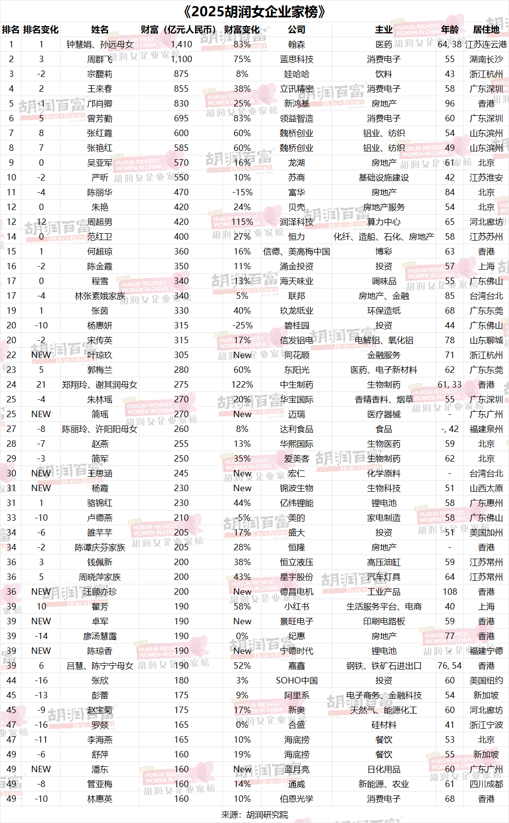 胡潤(rùn)研究院發(fā)布《2025胡潤(rùn)女企業(yè)家榜》