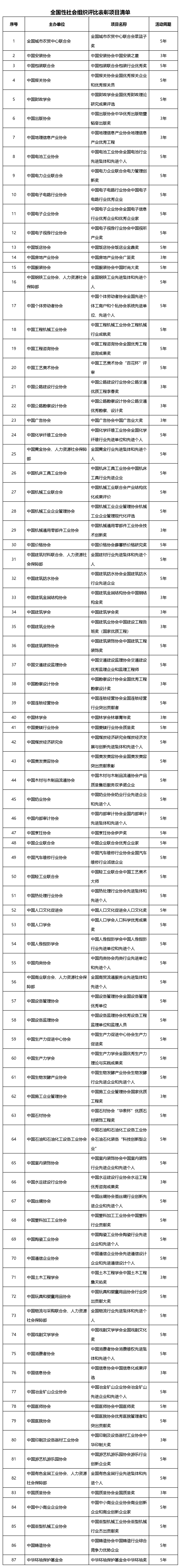 按照黨中央、國(guó)務(wù)院關(guān)于清理優(yōu)化創(chuàng)建示范和評(píng)比表彰活動(dòng)相關(guān)工作要求,依據(jù)社會(huì)組織評(píng)比表彰活動(dòng)管理有關(guān)規(guī)定,經(jīng)履行相關(guān)工作程序,現(xiàn)公布全國(guó)性社會(huì)組織評(píng)比表彰項(xiàng)目清單。
