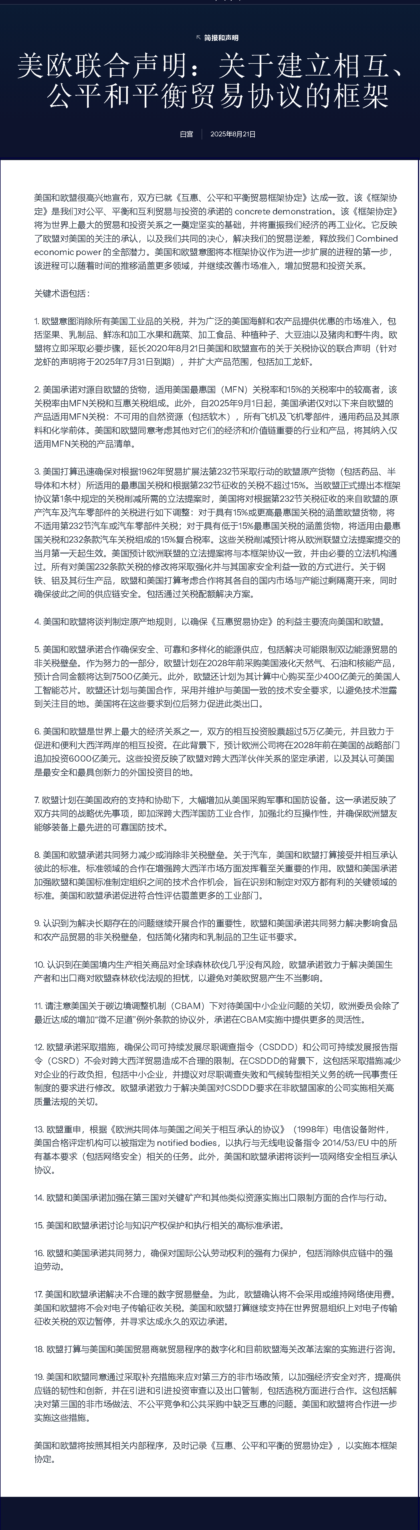 美國和歐盟很高興地宣布,雙方已就《互惠、公平和平衡貿易框架協(xié)定》達成一致。該《框架協(xié)定》是我們對公平、平衡和互利貿易與投資的承諾的 concrete demonstration。該《框架協(xié)定》將為世界上最大的貿易和投資關系之一奠定堅實的基礎,并將重振我們經(jīng)濟的再工業(yè)化。它反映了歐盟對美國的關注的承認,以及我們共同的決心,解決我們的貿易逆差,釋放我們 Combined economic power 的全部潛力。美國和歐盟意圖將本框架協(xié)議作為進一步擴展的進程的第一步,該進程可以隨著時間的推移涵蓋更多領域,并繼續(xù)改善市場準入,增加貿易和投資關系。