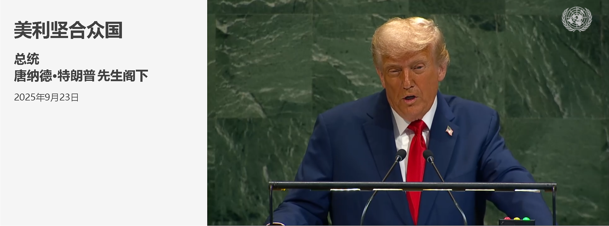 根據(jù)白宮新聞稿,特朗普在聯(lián)合國大會上發(fā)表了近一小時的講話,“毫不掩飾地宣揚美國的力量,有力地譴責了破壞性全球主義,并呼吁各國共同對抗恐怖主義、移民、生物戰(zhàn)和文化認同喪失等威脅”。