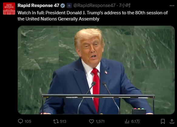 23日,特朗普在聯(lián)合國大會發(fā)表講話 推文截圖