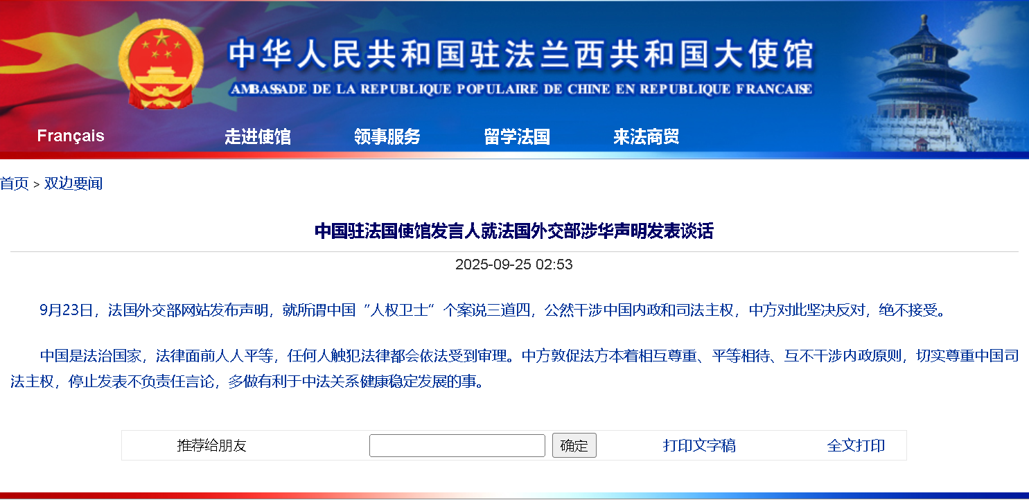 9月25日,中國駐法國使館發(fā)言人發(fā)表談話,對(duì)法國外交部9月23日發(fā)布的涉華聲明作出強(qiáng)硬回應(yīng)。中方用“堅(jiān)決反對(duì)、絕不接受”八個(gè)字,徹底劃清了紅線。