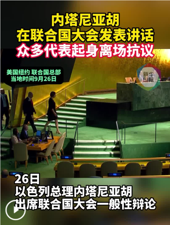 當(dāng)日,以色列總理內(nèi)塔尼亞胡在第80屆聯(lián)合國大會一般性辯論發(fā)言。眾多聯(lián)合國會員國代表起身離席,退場抗議。新華社記者吳曉凌攝