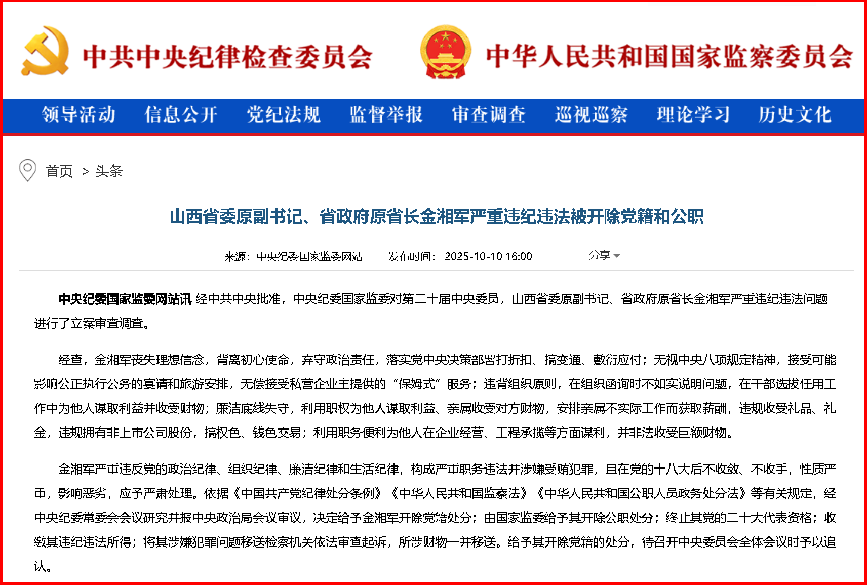 新華社北京10月10日電 經(jīng)中共中央批準,中央紀委國家監(jiān)委對第二十屆中央委員,山西省委原副書記、省政府原省長金湘軍嚴重違紀違法問題進行了立案審查調(diào)查。