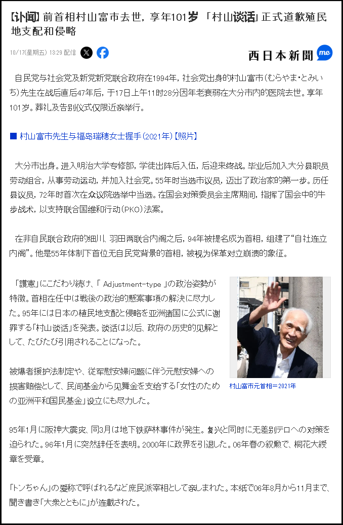新華社北京10月17日電(記者溫馨、袁睿)日本前首相村山富市17日去世,享年101歲。外交部發(fā)言人林劍在當(dāng)日例行記者會(huì)上表示,中方對(duì)村山富市前首相逝世表示沉痛哀悼,向家屬致以誠(chéng)摯慰問(wèn)。村山富市先生為促進(jìn)中日友好事業(yè)所作出的貢獻(xiàn)將被永遠(yuǎn)銘記。